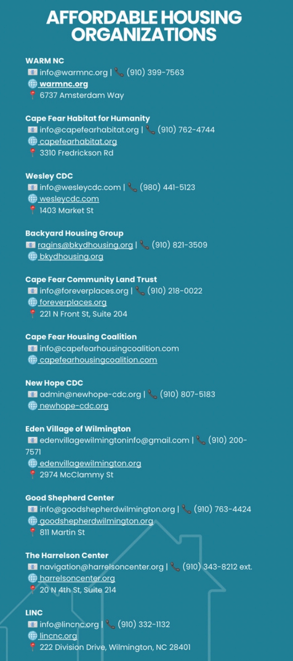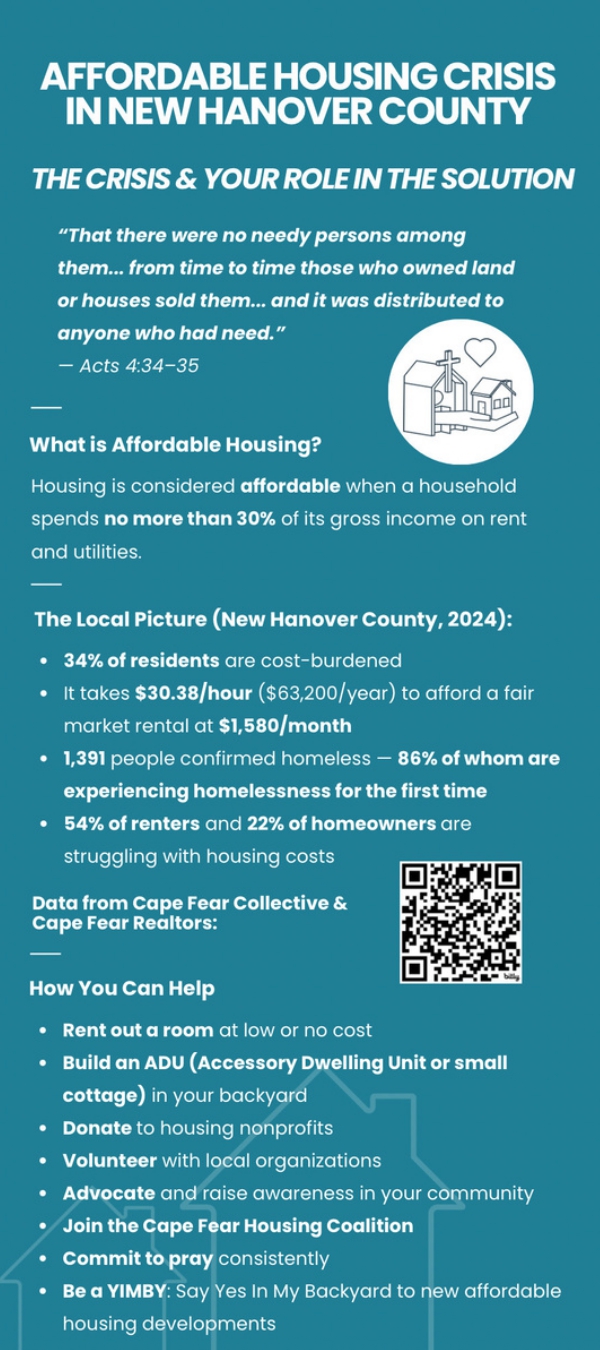 We are helping to educate and connect individuals, churches, nonprofits, and businesses to make impact to increase more affordable housing in the Cape Fear region. We are a part of the Cape Fear Housing Coalition: https://capefearhousingcoalition.com/ and encourage others to join as well.